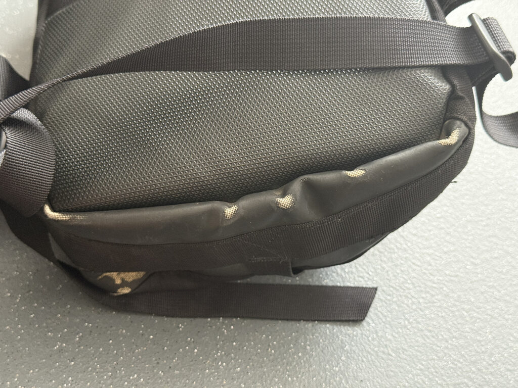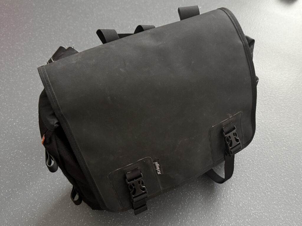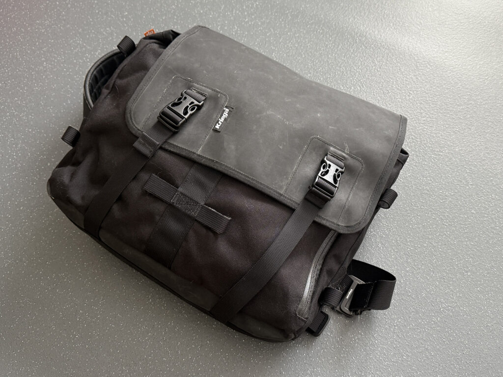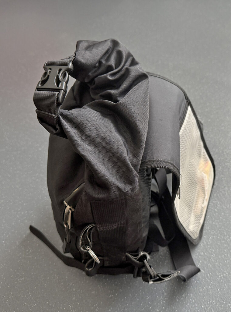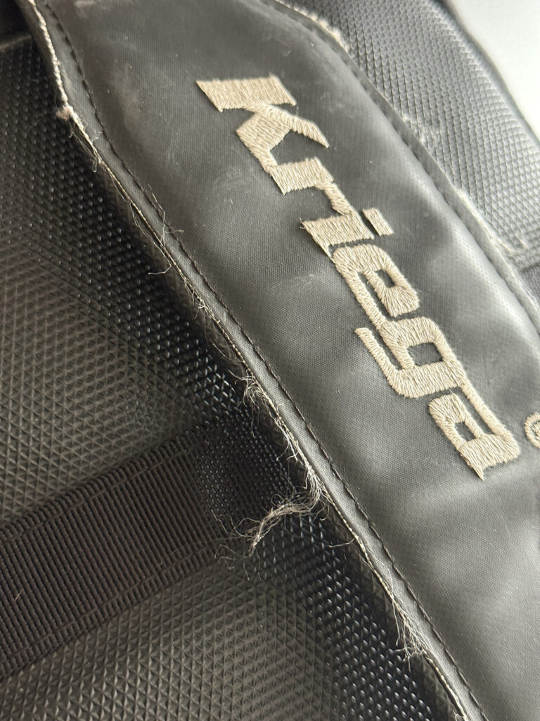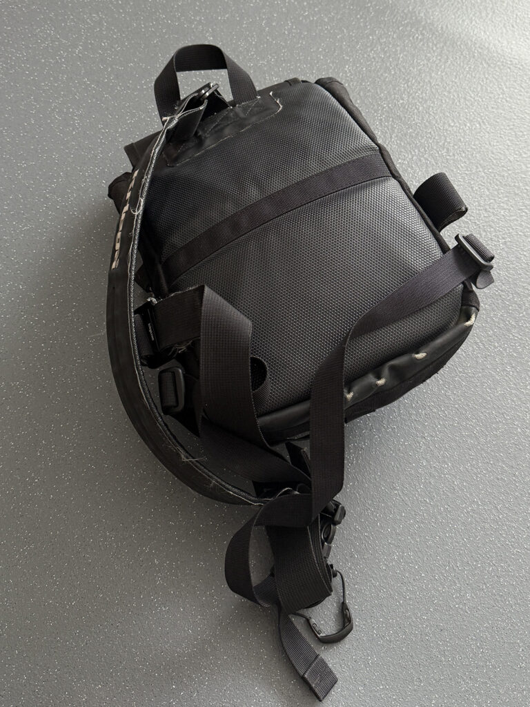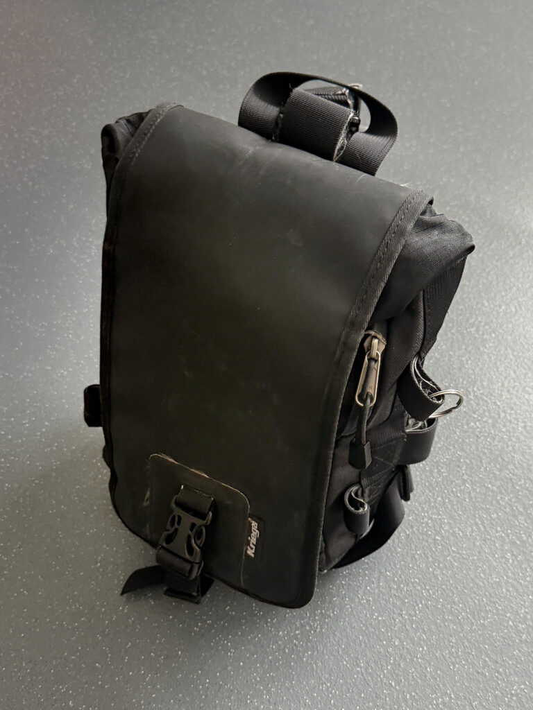 For many, many years this Sling bag was my go-to option when it came to day-to-day activities, both on and off the bike. It has half the capacity of the Urban Messenger bag at 8 litres but it is also much more compact to lug around – perfect for carrying a small MacBook Air with space for a wallet, camera, and a spare T-shirt. For its small size it can fit a surprising amount of stuff making it fantastically versatile. The main shoulder strap can also be converted to go over either left or right shoulder. It has been a constant companion over the last decade on every family holiday and I probably wear it more off the bike than on. There’s a direct comparison with the bigger Urban Messenger in spec too, as it features a similar specification. Single large waterproof roll-top compartment with removable washable liner, inside zipped mesh pocket and outside zip pocket. Of all my Kriega bags, this is the one that shows the most wear and tear, notably on the base where it’s been chucked on the ground. It remains 100% serviceable though and still in regular use.