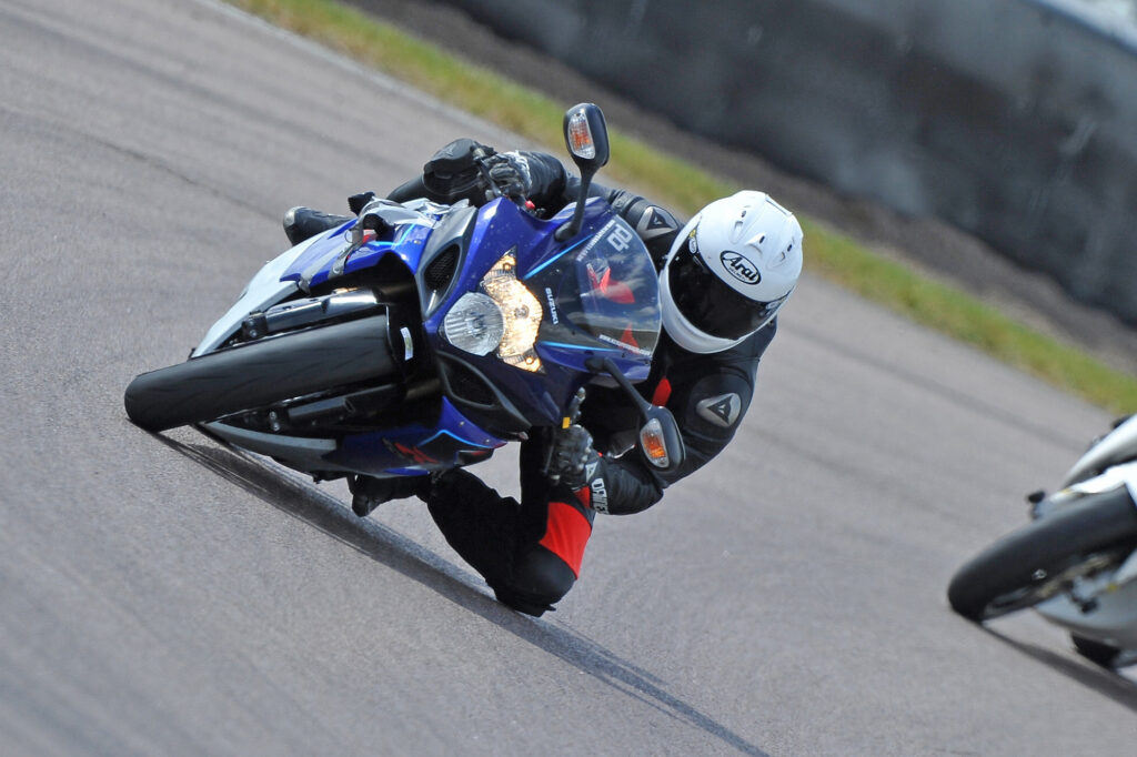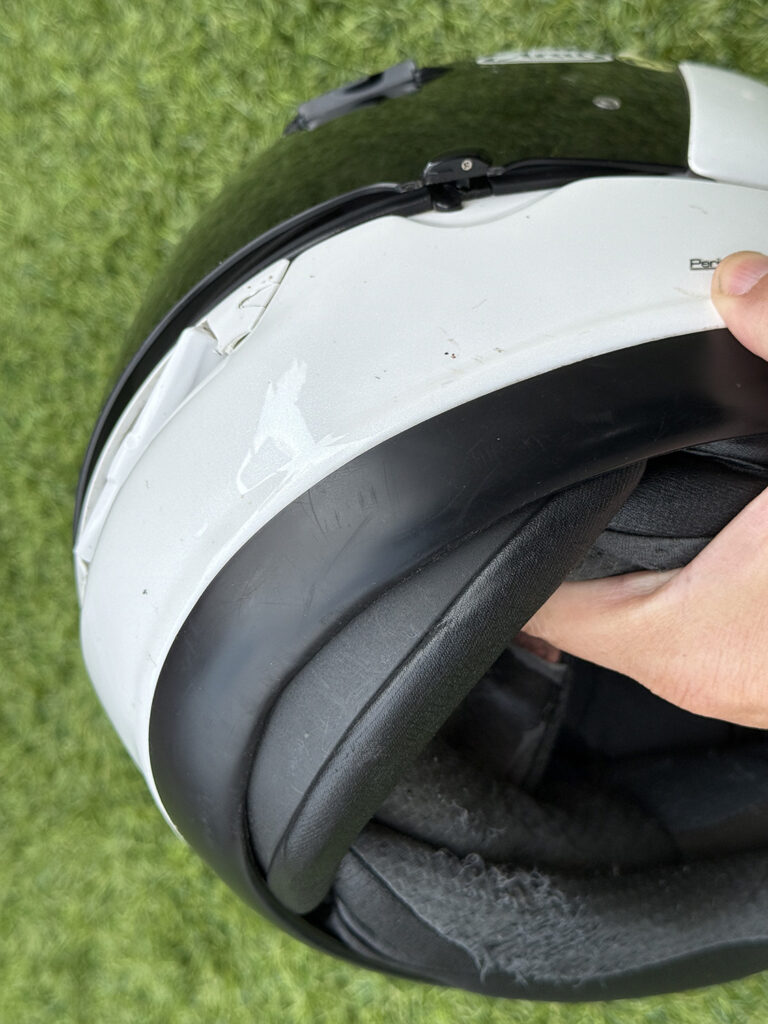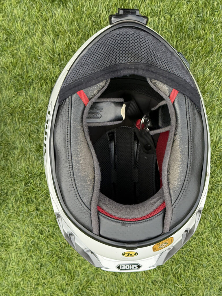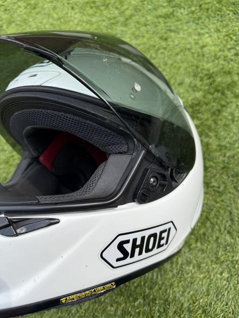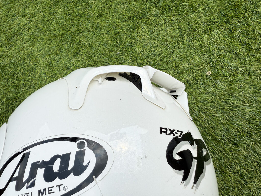 Visibility through the visor is as good as you’d imagine – Arai actually increased the visor aperture on the GP over its predecessor – and the, um, unique way the visor itself mounts underneath the helmet side pods means the visor stops exactly where you want it to the millimetre. The downside (for me at least) is the visor-changing mechanism itself. Years of practice on this and the process still raises my anxiety levels, as I still haven’t perfected it. While some people can switch visors over in seconds it always seems to take me longer. One time coming back from France I actually broke the sidepod off completely and had to tape my visor in place. Is it a deal-breaker? No… but it is annoying.
