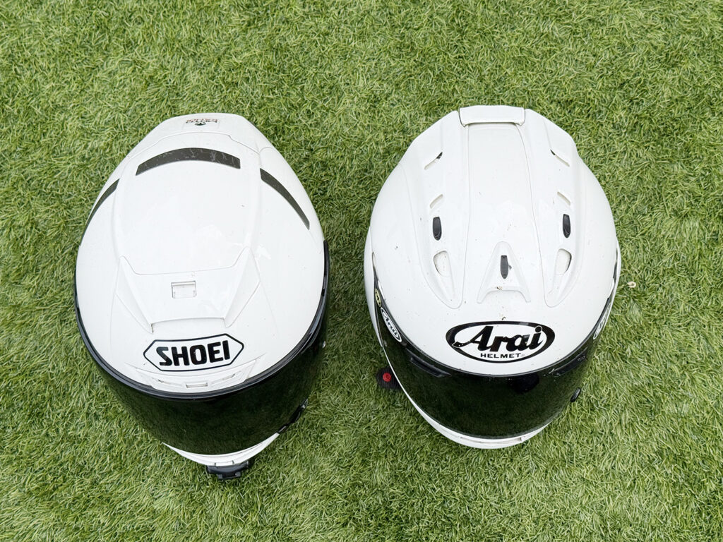 Aaaand in the blue corner, we have the RX7 GP, Arai’s equivalent to the X-Spirit. It too features different shell sizes for better fitting across a greater length of time, a really comfortable place to stick your head and the BEST vents on any of the 20-plus motorcycle helmets I’ve tested over the last 30 years, and that includes three other Arais – a Quantum, an RX7-RR4 and an RX7 Corsair. Build quality and design on the RX7 is excellent with all the switches clicking with the satisfaction of a Mercedes door clunk.