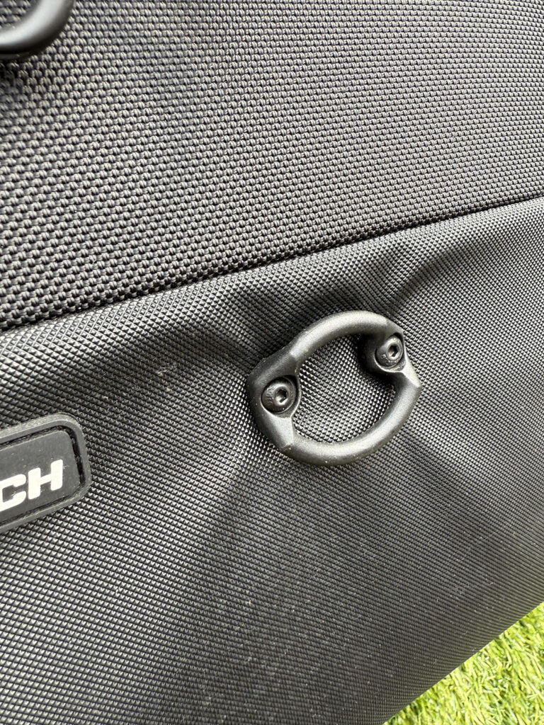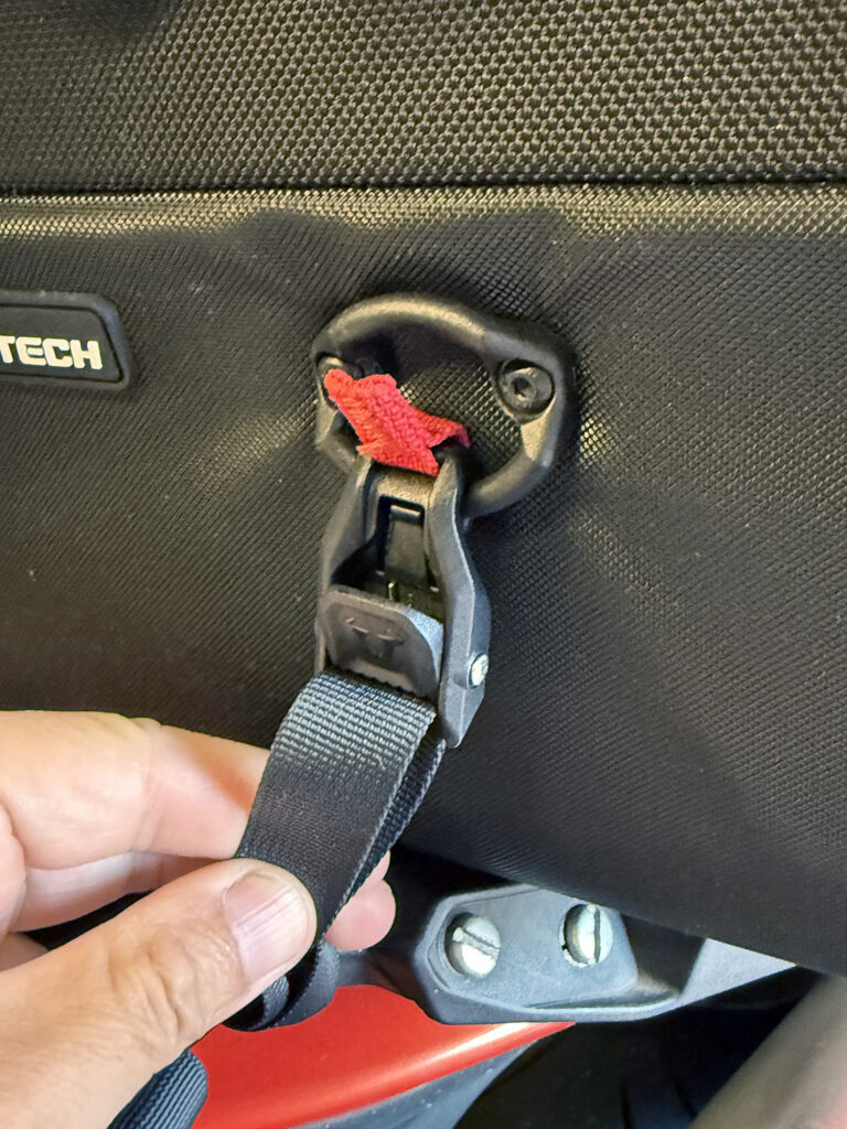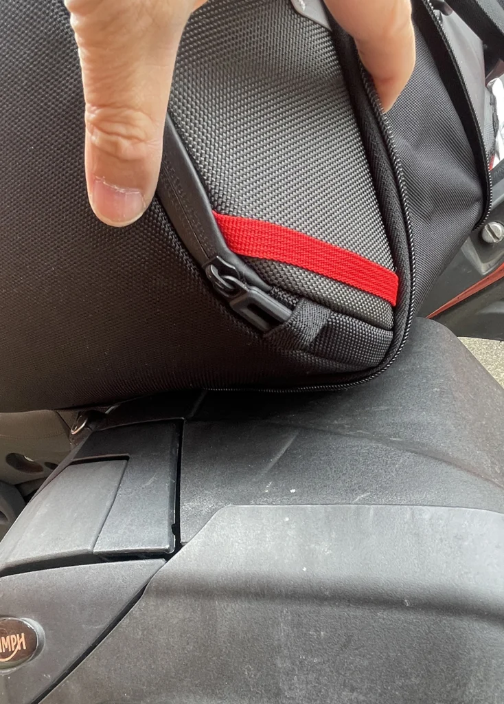 Attaching the bag to the bike using the four supplied straps is simplicity itself. Each of the straps has its own loop to go around a bike rack/subframe/pillion peg/grab rail/other secure point, then it simply hooks onto one of the twelve strategically placed points before a little tug on the strap tightens it. To release just press down on the strap’s clamp and pull it free. I’ve been using the bag on the Triumph Tiger and although it doesn’t have a rack it sits securely on the pillion seat and doesn’t budge, thanks in part to the grippy base.